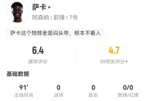 直播吧2月23日讯 阿森纳在本轮英超对阵热刺,萨卡本场数据如下: