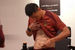 已退役1年!U23国足比腹肌,37岁助教于大宝亮腹肌:我就剩两块了