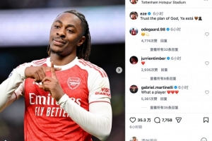 直播吧2月23日讯 英超第27轮,阿森纳客场4比1大胜热刺,笑傲北伦敦德比。赛后,梅开二度的埃泽更新社媒庆祝胜利。