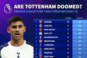 直播吧2月23日讯 德国转会市场统计了英超各队第19轮比赛以来拿到的积分,并列出榜单,阿森纳19分最多,热刺4分垫底。