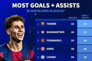 直播吧2月24日讯 《转会市场》统计了本赛季五大联赛中场球员在各项赛事直接参与进球情况,费尔明领跑。