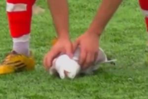 球队队长发现情况后,第一时间跑向这只小鸟。他看到鸟儿毫无反应、无法呼吸,便立刻为它做起心肺复苏。