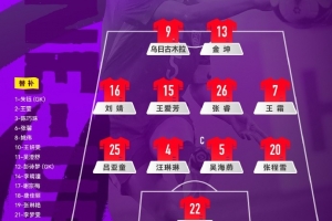 附中国女足官方阵型:22-陈晨;25-吕亚童、4-汪琳琳、5-吴海燕、20-张程雪;16-刘靖、15-王爱芳、26-张睿、7-王霜;9-乌日古木拉、13-金坤