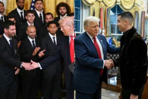 直播吧03月06日讯 今日,梅西率领迈阿密国际造访白宫,特朗普发表讲话时谈及梅西和C罗。