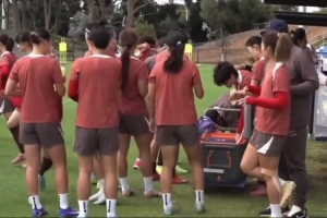 直播吧3月14日讯 今天中午13点,女足亚洲杯1/4决赛,中国女足将对阵中国台北女足。记者艾婷婷拍摄了中国女足赛前训练的画面。