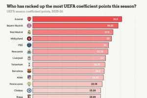 直播吧03月14日讯 The Athletic统计了欧洲联赛俱乐部本赛季目前为止挣得的欧足联系数积分,阿森纳以30.5分领跑,拜仁、皇马、中日德兰、巴黎位列前五。