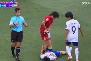 中国台北女足球员抽筋,张睿帮她压腿,前者随后被担架抬下