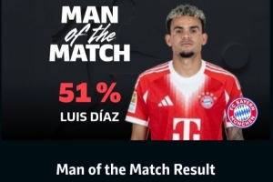 直播吧3月15日讯 德甲第26轮,拜仁客场1-1战平勒沃库森,赛后拜仁边锋路易斯·迪亚斯51%得票率当选全场最佳球员。