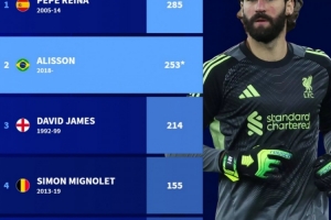 直播吧3月15日讯 阿利松与利物浦正式完成续约,德转也盘点了利物浦队史门将球员在英超出场次数榜,具体如下: