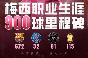 梅西900球分布:巴萨672球、阿根廷115球、巴黎32球、迈阿密81球