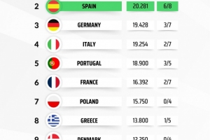 直播吧3月20日讯 欧战1/8决赛战罢,媒体列出了本赛季各联赛欧战积分排名,英超24.791分居首,只需要一场平局就能锁定额外欧冠席位,西甲20.281分次席,6支球队晋级欧战8强形势大好。