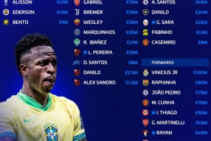 直播吧3月20日讯 巴西公布了最新一期国家队大名单,德转市场罗列本期巴西国家队球员的身价。其中皇马前锋维尼修斯以1.5亿欧元身价断层领跑榜单,巴萨前锋拉菲尼亚以8000万欧元排名第二。