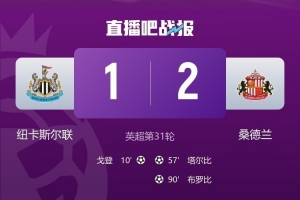直播吧3月22日讯 英超第31轮“泰恩-威尔德比”,纽卡斯尔主场1-2被桑德兰逆转。戈登首开记录,塔尔比扳平,布罗比上演绝杀。
