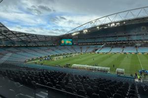 直播吧03月27日讯 14:00FIFA系列赛,中国男足在悉尼澳大利亚体育场对阵库拉索。赛前半小时,记者马德兴在现场晒照,双方球员正在热身,但球场几乎没有球迷。