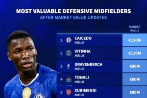 直播吧4月11日讯 德国转会市场列出了防守型中场(DM)德转身价排名,凯塞多、维蒂尼亚1.1亿欧居首。
