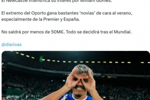直播吧4月15日讯 据记者Eduardo Burgos报道,纽卡斯尔有意引进波尔图球员威廉·戈麦斯。