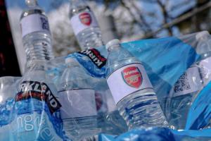 直播吧04月19日讯 据记者James Olley报道,有曼城球迷在阿提哈德球场外售卖贴有阿森纳队徽的矿泉水,售价2镑一瓶。