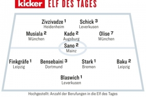 直播吧4月27日讯 德国媒体《踢球者》评出了德甲第31轮最佳阵容,奥利塞、穆西亚拉、希克在列。