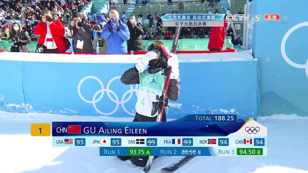 [谷爱凌三轮] 谷爱凌最后跳出94.5得分 总分为188.25反超夺金
