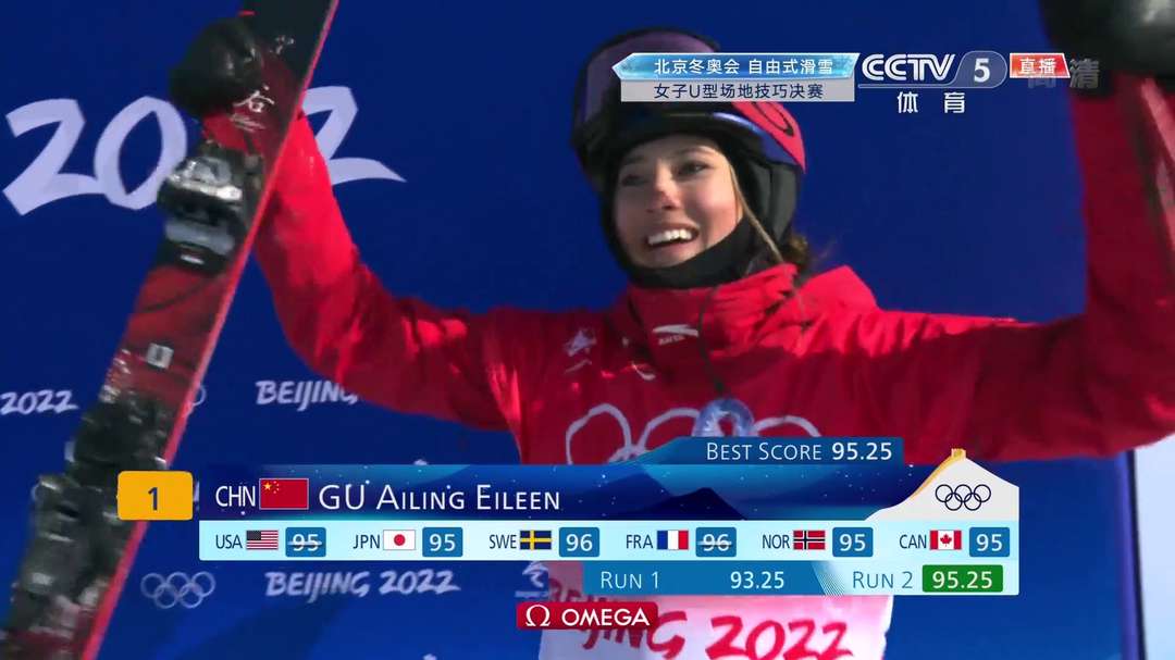 [CCTV视频] U型场地技巧决赛第二跳:谷爱凌超强95.25分甩开对手一档