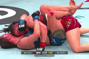 [张伟丽打破对手眉角] 场面有点血腥啊!张伟丽直接把对手眉角打破了,对手膝盖也磕破了